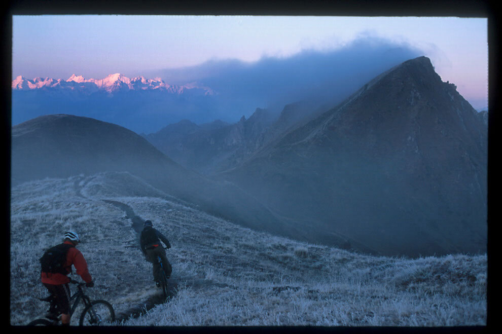Three years ago, 32-year-old Chris Winter, an entrepreneur and avid rider, started researching the possibility of guiding bike tours in the Swiss Alps, a place he had spent a portion of his childhood skiing, a place he had always had an infatuation for. His quest led him to 33-year-old Francois Panchard—a fellow not normal by Swiss standards. The son of a mountain climber, Panchard’s freaky green eyes and conniving grin belies a certain imbalance. He is not following the footsteps of his thirty-something peers, taking high profile jobs in New York and Paris, making heaps of cash in Geneva playing with oil baron cash, driving BMW’s with in-dash DVD players and wearing designer clothes and fancy watches. Instead, Panchard runs his own CD-Rom trail mapping business, spending day after day documenting the labyrinth of singletrack that drapes his country like a giant gill net. He lives high in the mountains in a tiny little cabin with his beautiful Hungarian wife, and almost every summer day he explores his homeland by bike. In the last four years he has gone from a tight, light cross-country rig (the Swiss mountain bike of choice) to a four and four all-mountain machine with disk brakes and wide rubber. Even still, he wants more suspension. Like I said, he is not a stereotypical Swiss.