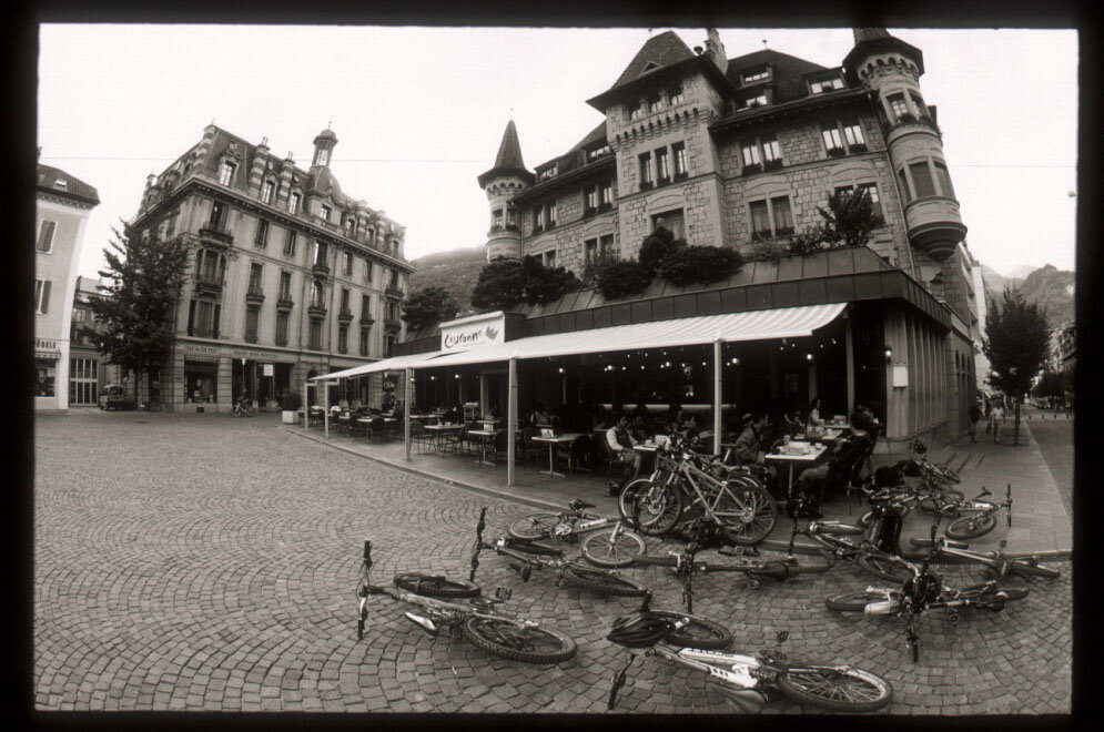 After 12 miles of solid, uninterrupted descending we whiz through vineyards to a village where we buy beers and cappuccinos and sandwiches. We load our bikes into the trailer, crowd into our van and drive an hour up the mountain-walled Rhone Valley to another neat little gondola, two at a time, up to a mountainside village. We spin through the narrow streets where cute blonde children wander amongst shiny little sport scars and stilted houses from the 1300’s. We stop at a grocery store where the Camelbak is stuffed with wine and cheese and more sausage and bottles of weak European beer. Then it’s off to another gondola, this one smaller than before–a ski lift, up to a modern little hostel tucked above the bullwheel. On a sun draped deck we indulge on Lowenbraus and views of glaciers and ragged peaks and lush green valleys. We drink and eat and try to recall the thousands of spectacular intricacies of the day, and the day before that, afraid we’ll forget because there are so many worth remembrance.