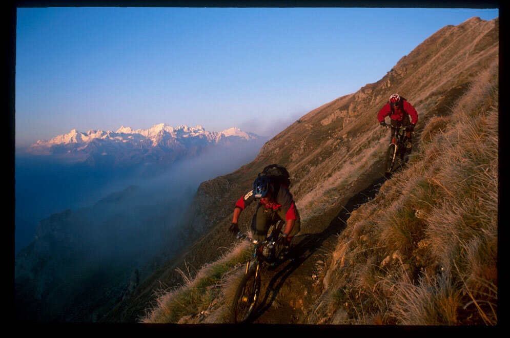 “The Swiss mountain biker rides up the gravel road and down the gravel road,” explains Panchard. “They don’t ride singletrack and they think lifts are for wimps.” But Panchard, like he’s done most of his life, has gone against the traditionalist ways of his countrymen and swallowed his pride. He rides lifts with his bike all the time. Almost all of them—of which there are hundreds—allow bikes, some on platforms, some on little hooks, some you have to hold yourself. From the top of each one spreads a weave of hiking trail, cow paths and doubletrack that meander through some of the world’s most spectacular mountains. Some traverse, some go up, but once you’ve won an elevation of 8,000 to 10,000 feet, most go down—for a long way.