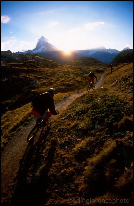 The acrid stink of burning brake compound, purpled steel and seared flesh rises through a cloud of man-sweat. In the Valais region of south western Switzerland, where grapes grow beside the Rhone River and cows with brass bells graze alpine meadows 8,000 feet above, and gondolas and trains and chairlifts zip between the two with uncommon ubiquity, we’ve stopped because we had to. Our forearms are so pumped they could be full of spinach. Eyes are so watery and red they could be filled with sorrow. But they’re not. The trail beneath our tires is ancient. It is also perfect.