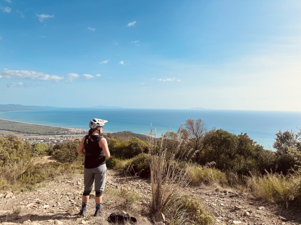 We then rolled out toward the coast, eventually reaching Castiglione della Pescaia, where the trails meet the sea. We checked into our ocean front (and ocean view!) hotel and geared up for more vertical. Riding along the coastline felt surreal—salt air, shimmering light, and yes, flamingos gliding effortlessly along the estuary. It was hot, unapologetically so, and when we finally reached a private beach with impossibly clear water, the contrast between effort and reward could not have been more perfect. I felt I had landed in my own version of heaven. My friend Lee-Anne was greeted with a playful crab clamping itself firmly on her foot to say hello; even she accepted this as a gift from Italy.