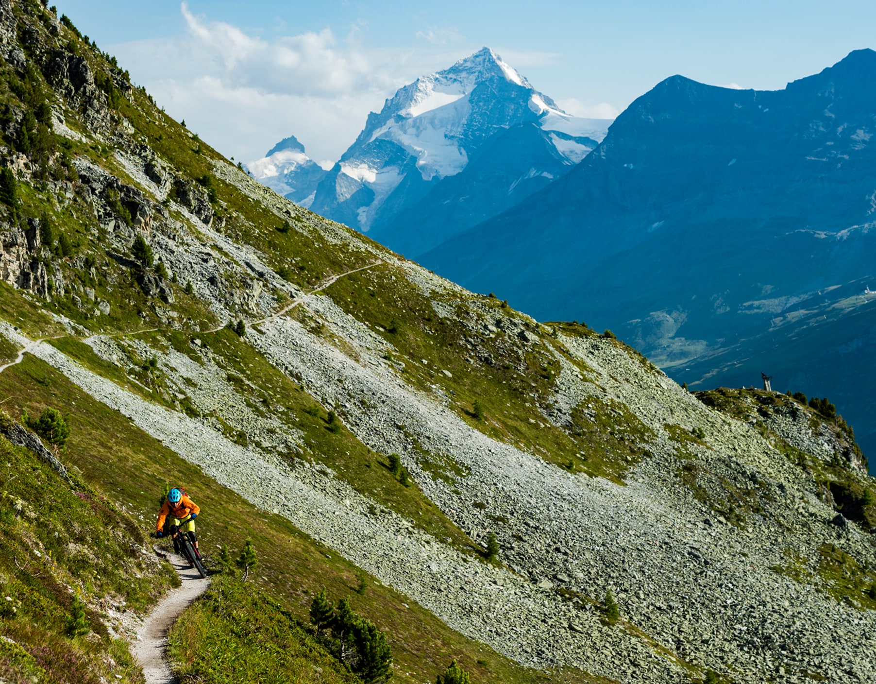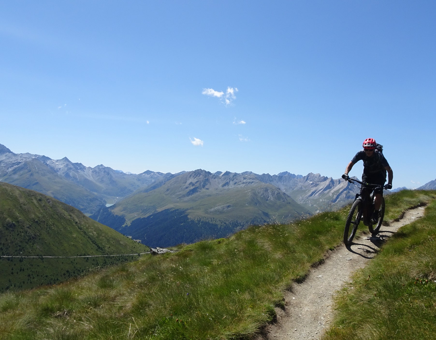 Rides are mostly over 2,000m and sometimes start as high as 3,000m. The singletrack trails are old hiking paths and are linked by sections of gravel roads, doubletrack and accessed by lifts, shuttle and climbing. Trail surfaces feature fixed rocks and rock gardens, with some dirt at lower elevations, switchbacks and steep sections. Expect some exposure at times, hike-a-bike sections and mostly open alpine riding with some forested sections in lower valleys.